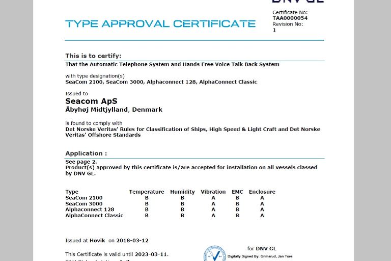 Our Type Approval certificate has just been renewed, now including the SeaCom 3000 and its accessories.